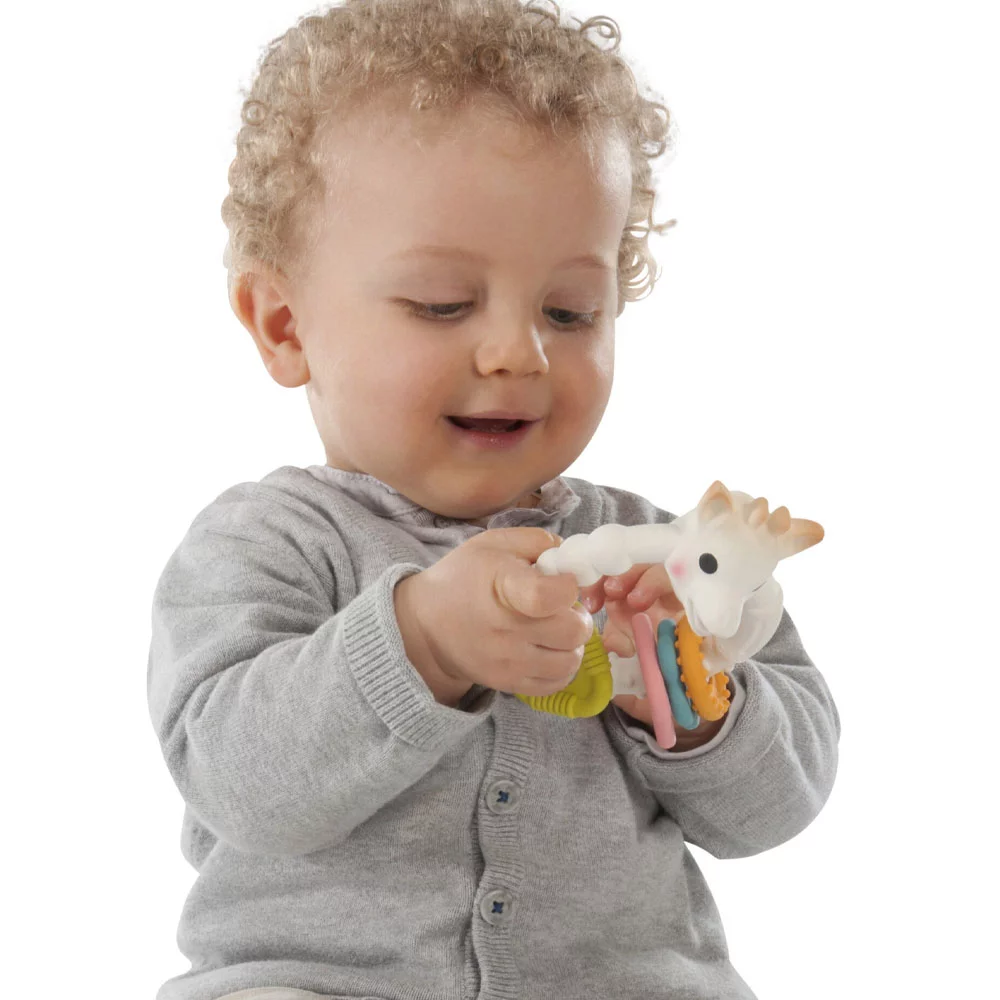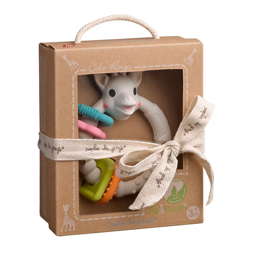 Un anneau de dentition coloré aux multiples textures Sain et naturel, cet anneau de dentition est composé de caoutchouc 100% naturel, tiré de la sève de l’hévéa, et de peinture alimentaire. Doté de nombreuses parties souples à mordiller et aux textures variées (picots, stries, oreilles et cornes de Sophie), il offre différents massages et soulage efficacement les gencives de bébé. Ces 4 formes géométriques aux couleurs vivent attirent le regard de bébé qui s’amuse à les faire coulisser autour de l’anneau principal. Léger et ergonomique, il est facile à saisir et à manipuler pour les petites mains.