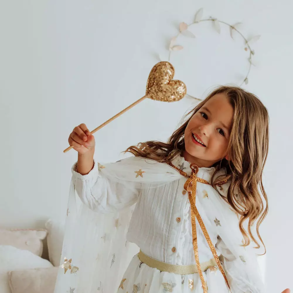 C’est l’accessoire indispensable des fées en herbe ! On associe la baguette magique en sequins dorés aux couronnes, capes et jupes en paillettes et vous voilà parée pour allumer les étoiles ! Composition: 35cm x 10 cm