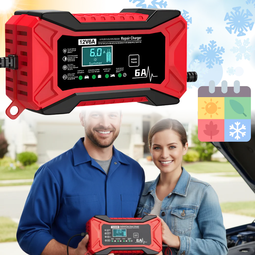 Gardez vos véhicules prêts à rouler grâce à ce chargeur intelligent 12 V pour batterie. Conçu pour les motos, les voitures, les SUV et bien d’autres véhicules, il offre une recharge intelligente automatique, un mode de réparation de batterie, un réglage saisonnier et une protection totale, le tout dans un appareil compact et puissant.