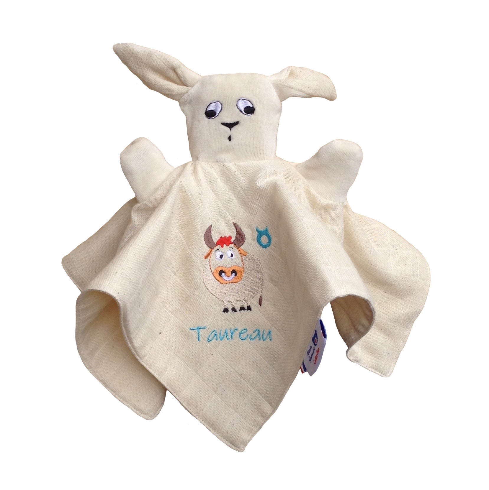 Doudous au choix à personnaliser au signe astrologique de bébé. Velours de coton 100% biologique GOTS. Motif zodiaque : Taureau