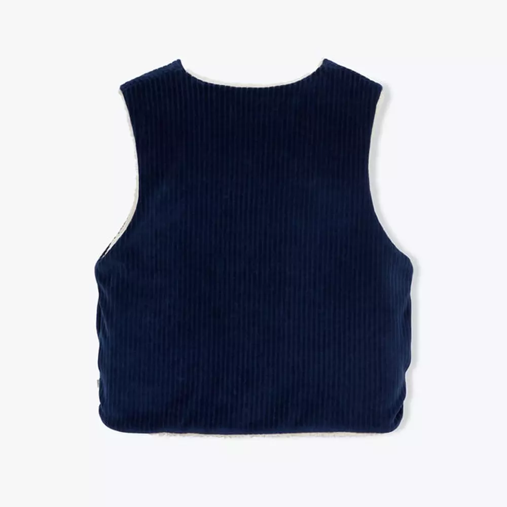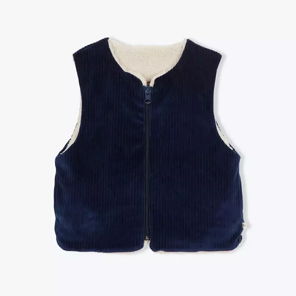 Gilet enfant réversible bien chaud et ultra pratique. 100% coton issu de l’agriculture biologique. Veste sans manches. Une face en velours côtelé marine 6, l’autre en sherpa beige. Ouverture zippée au devant. Petite étiquette drapeau cousue à la couture.