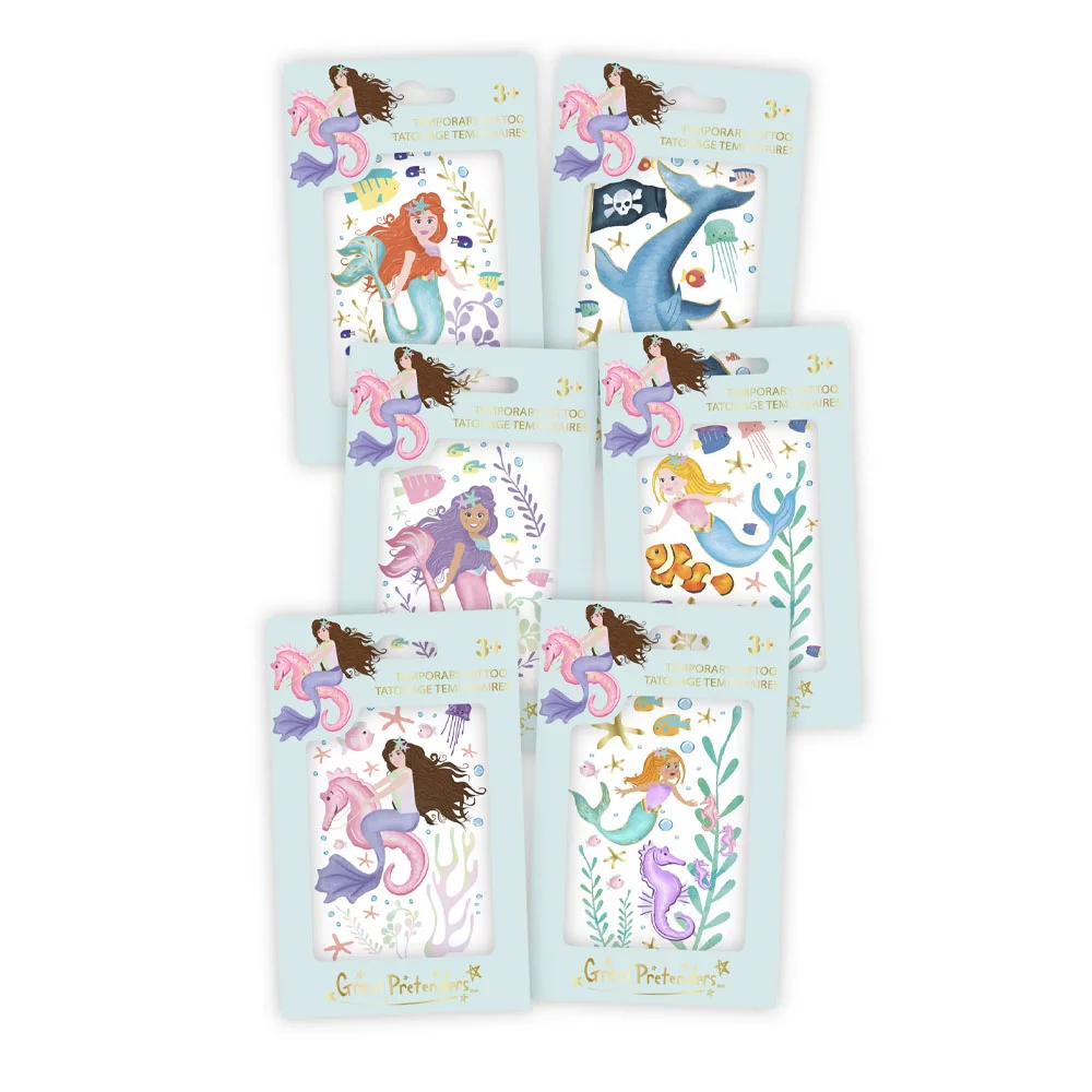 Faites une éclaboussure avec nos tatouages de sirène magiques ! Chaque pack est livré avec un assortiment de 6 grands tatouages avec des motifs inspirés de la sirène et de l’océan. Parfait pour les cadeaux de fête !