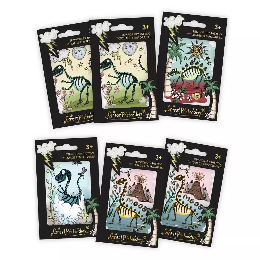 Montrez votre passion pour tout ce qui est préhistorique avec nos nouveaux tatouages de dinosaures. Chaque paquet de tatouages de la taille d’un dino est disponible dans un assortiment de 4 styles, ce qui en fait la faveur de fête parfaite!