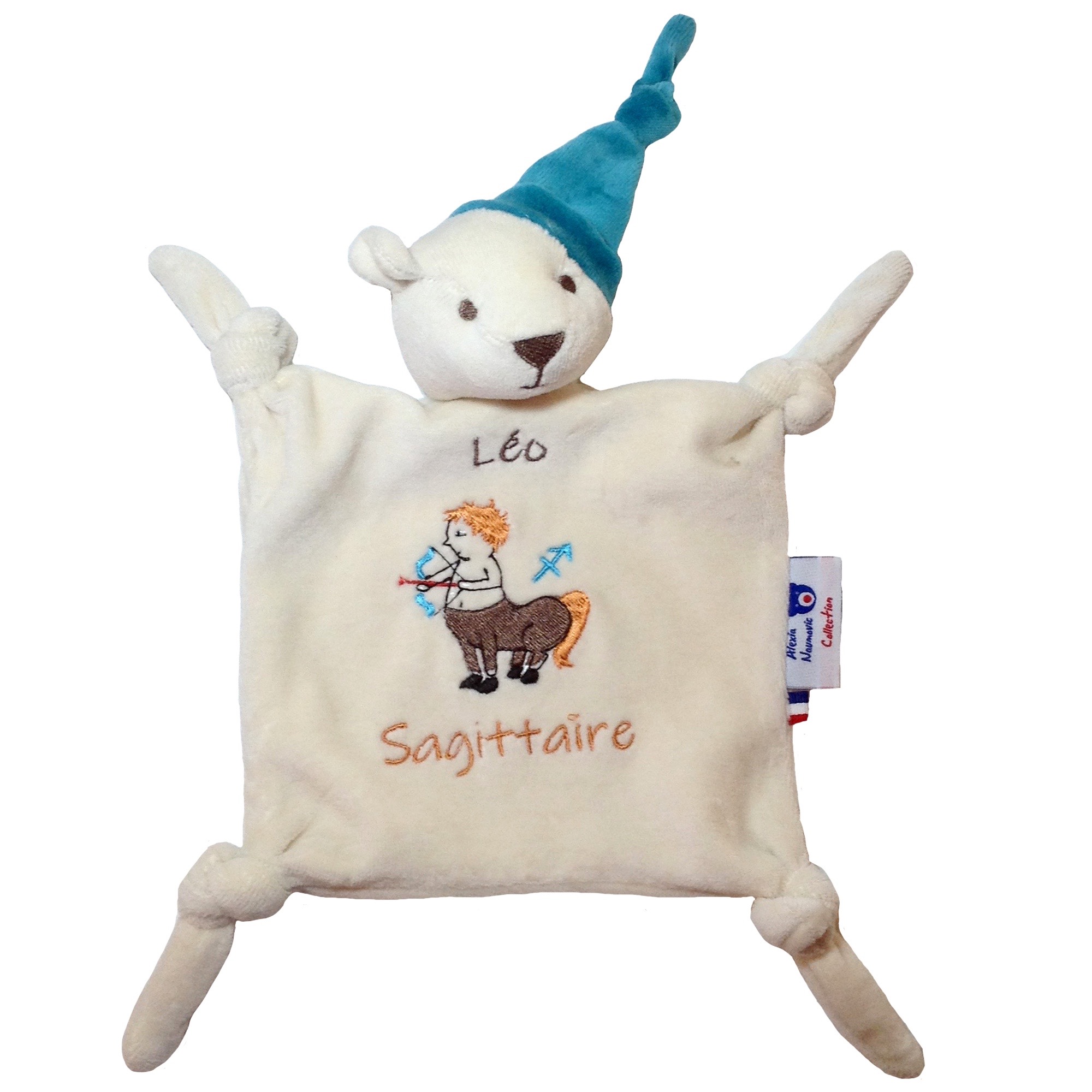 Doudous au choix à personnaliser au signe astrologique de bébé. Velours de coton 100% biologique GOTS. Motif zodiaque : Sagittaire