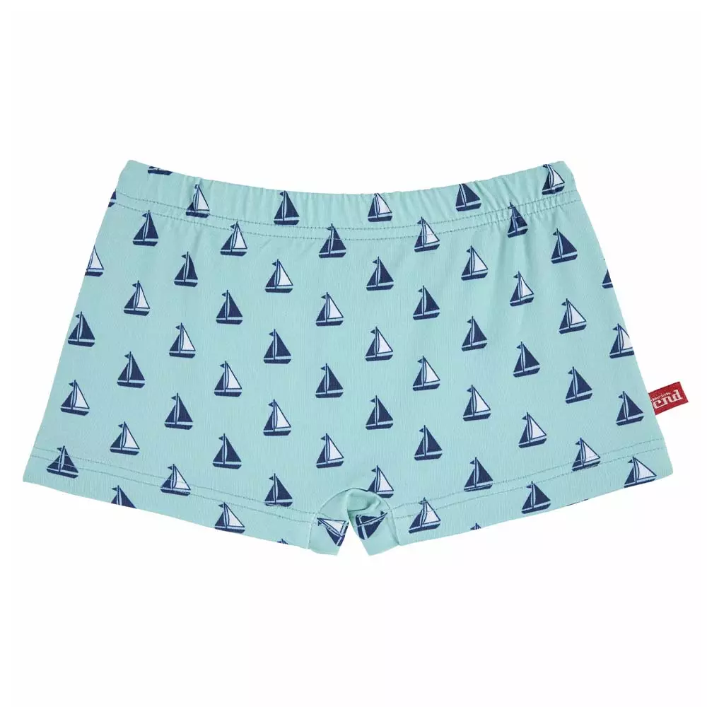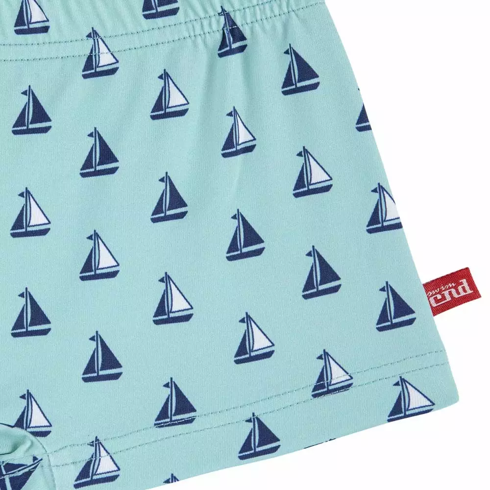 Maillot de bain garçon de style boxer, imprimé voiliers. Tissu à indice de protection UPF50 92% nylon, 8% élasthanne (Lycra®) Fabriqué en Espagne. Boys boxer-style swimsuit with an aquamarine sailboat print. Fabric with UPF50 protection 92% nylon, 8% elastan (Lycra®) Made in Spain.