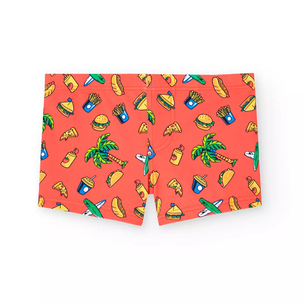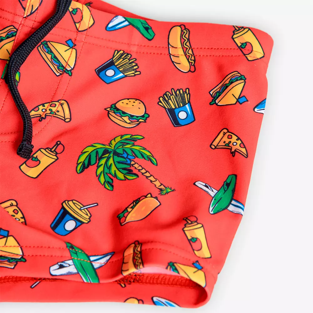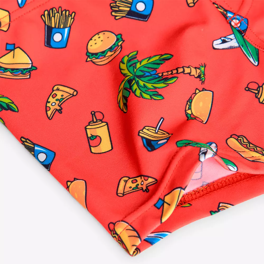 Préparez-vous pour un été plein de style et de plaisir avec notre maillot de bain pour garçon ! Ce maillot se distingue par ses motifs estivaux vibrants, avec un fond rouge agrémenté de palmiers, hamburgers, fruits et bien d’autres éléments frais qui évoquent les meilleures ambiances de la saison. Conçu en polyamide de haute qualité, ce maillot de bain est non seulement durable et résistant, mais aussi très facile à laver et à sécher, idéal pour les parents qui recherchent la praticité sans compromettre le style. Son tissu extensible offre un confort total, parfait pour les aventures à la plage…