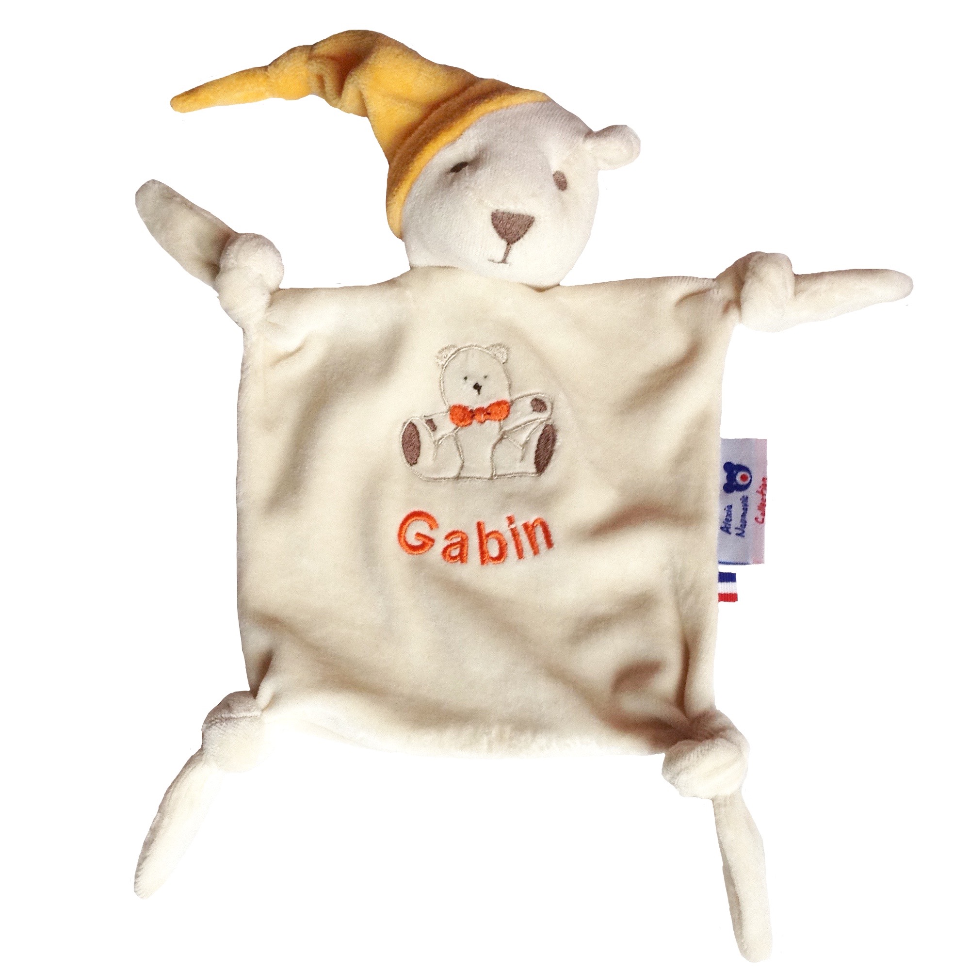 Doudou ours en velours de coton 100% biologique avec son bonnet de couleur. Broderie ours et personnalisation prénom en option.