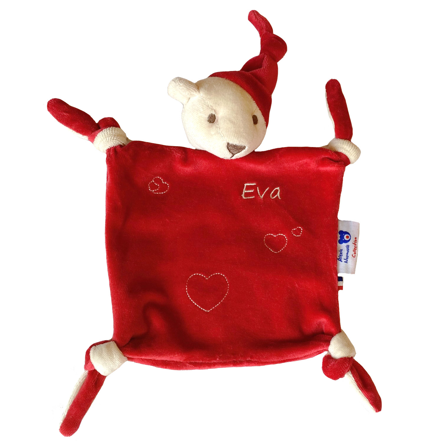 Doudou ours et son bonnet de nuit en coton biologique entièrement fabriqué en France. Le doudou est proposé avec différents coloris de broderie. Motifs coeur avec personnalisation prénom. Pour fille ou garçon, c’est un doudou très facile à attraper, avec ses petits noeuds aux extrémités. Teddy Bear des tous petits pour l’éveil et le sommeil de bébé. Un cadeau de naissance éthique, et durable fabriqué 100% en Ile de France.
