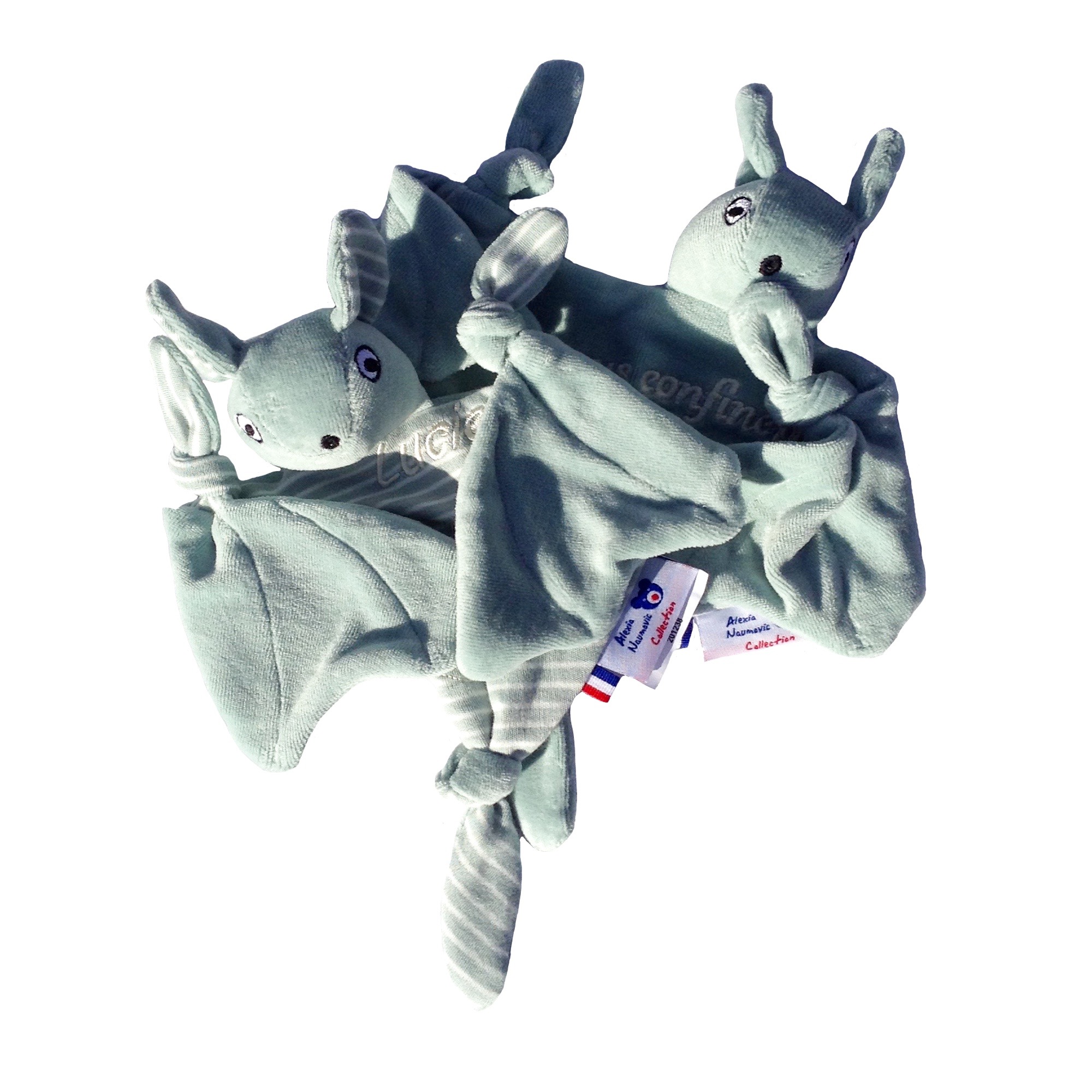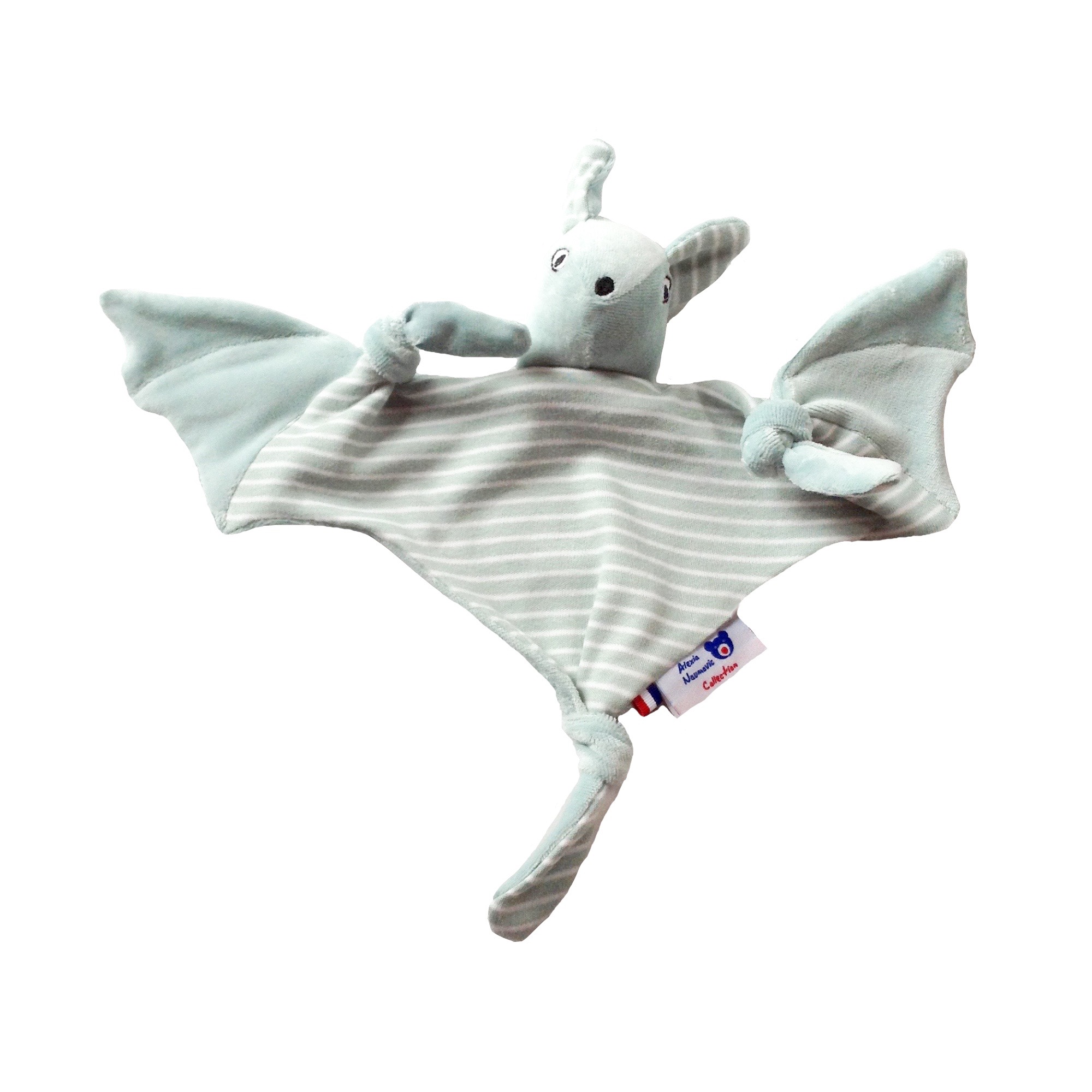 Doudou Roussette est une petite chauve-souris en velours de coton biologique certifié GOTS à broder avec le prénom de bébé. Elle est facile à attraper par bébé avec ses petits noeuds aux extrémités. Ses ailes peuvent se replier. C’est un joli cadeau personnalisé à offrir dès la naissance pour fille ou garçon.
