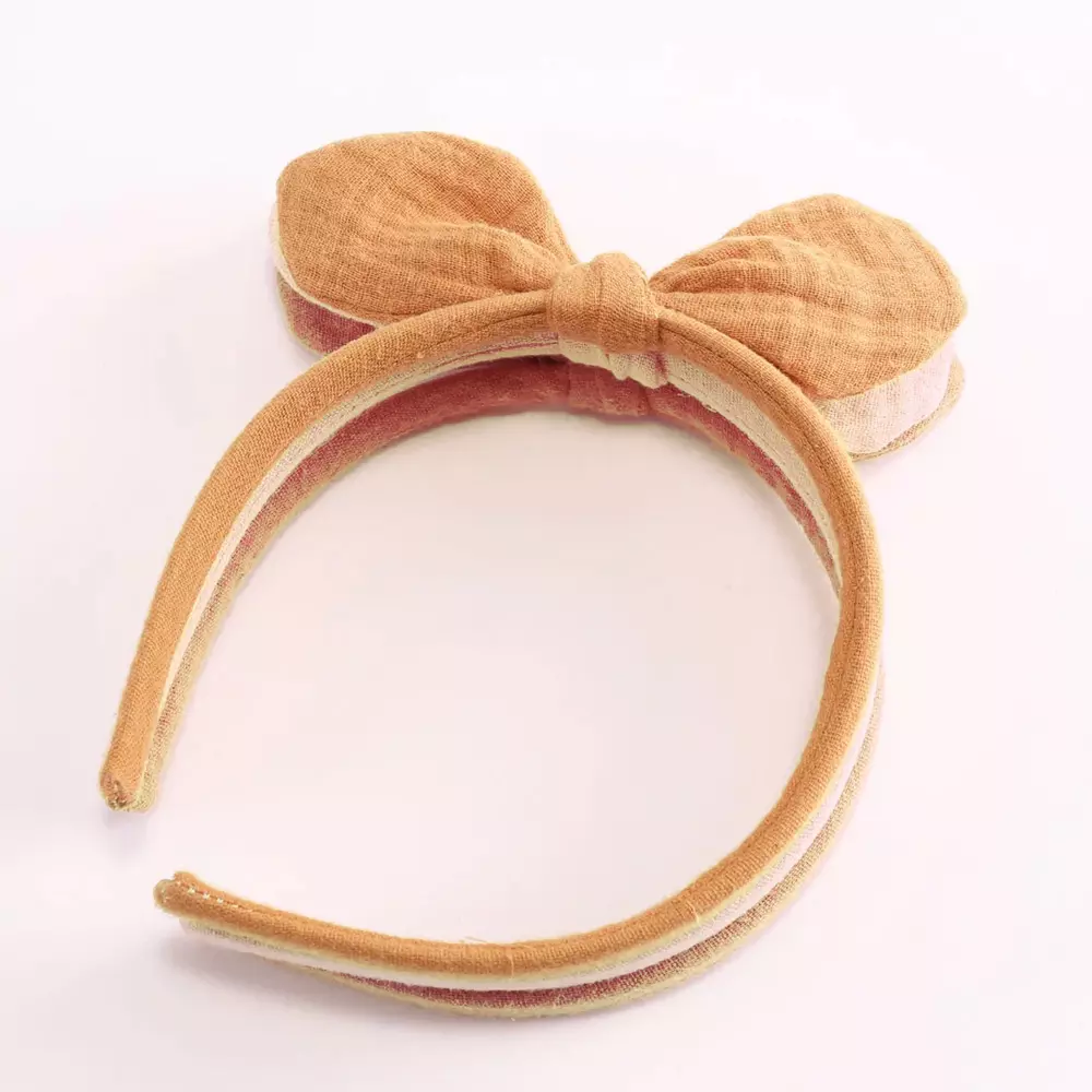 Ce serre-tête en double gaze ocre permettra de maintenir facilement et avec élégance les cheveux des petites. Il est rehaussé d’un nœud amovible. Accessoire tendance et pratique pour les tenues quotidiennes ou les occasions spéciales. Largeur de 1,2 cm, fabriqué à la main pour les enfants à partir de 4 ans.