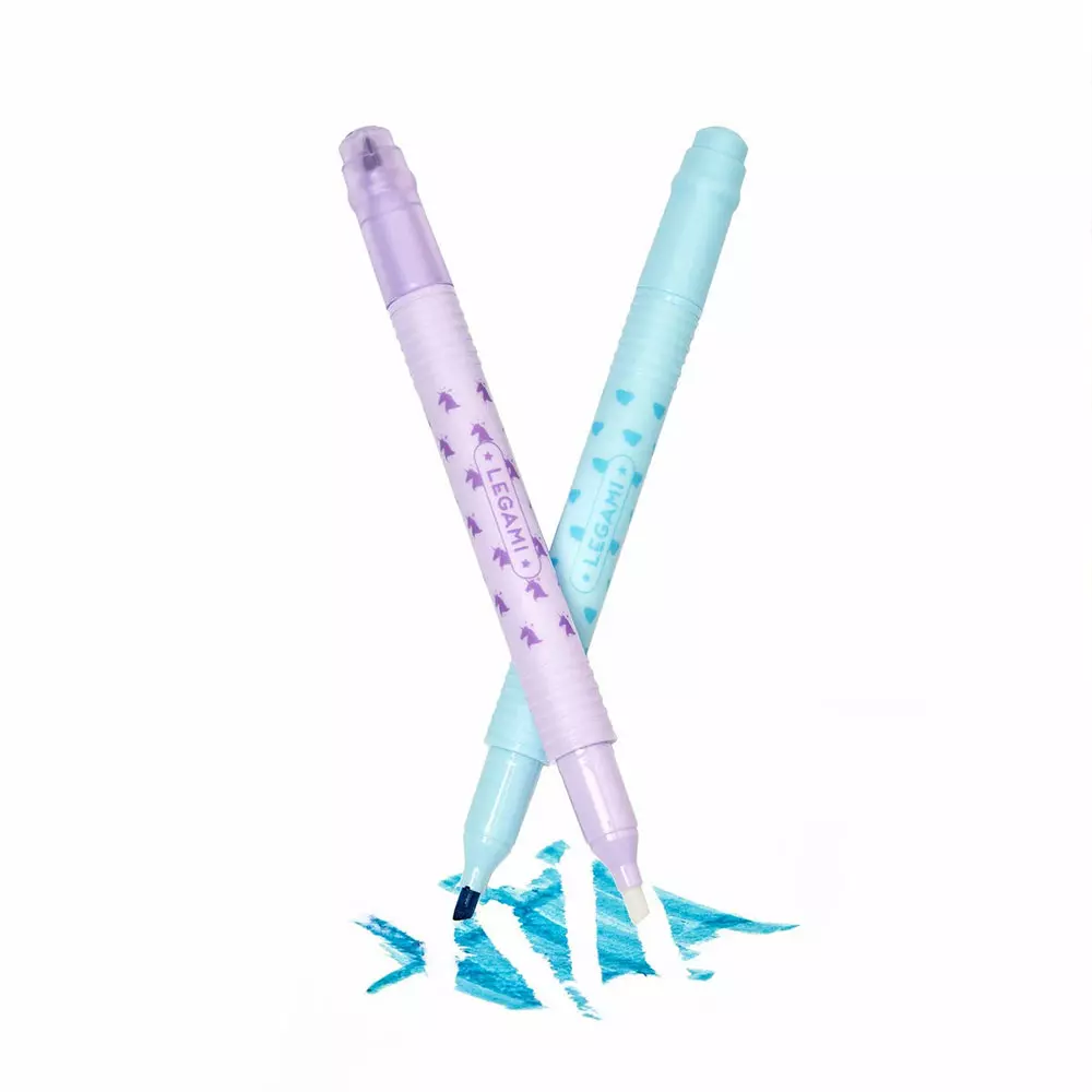 Set de 6 Surligneurs Effaçables – Magic Highlighters de Legami. Chaque feutre dispose d’une double pointe : vous pouvez utiliser une pointe pour souligner et surligner, lorsque vous changez d’idée il vous suffit de retourner le feutre et d’utiliser l’autre pointe pour effacer. Adaptés aussi bien aux traits fins qu’épais Couleurs : jaune, orange, rouge, violet, bleu clair et vert
